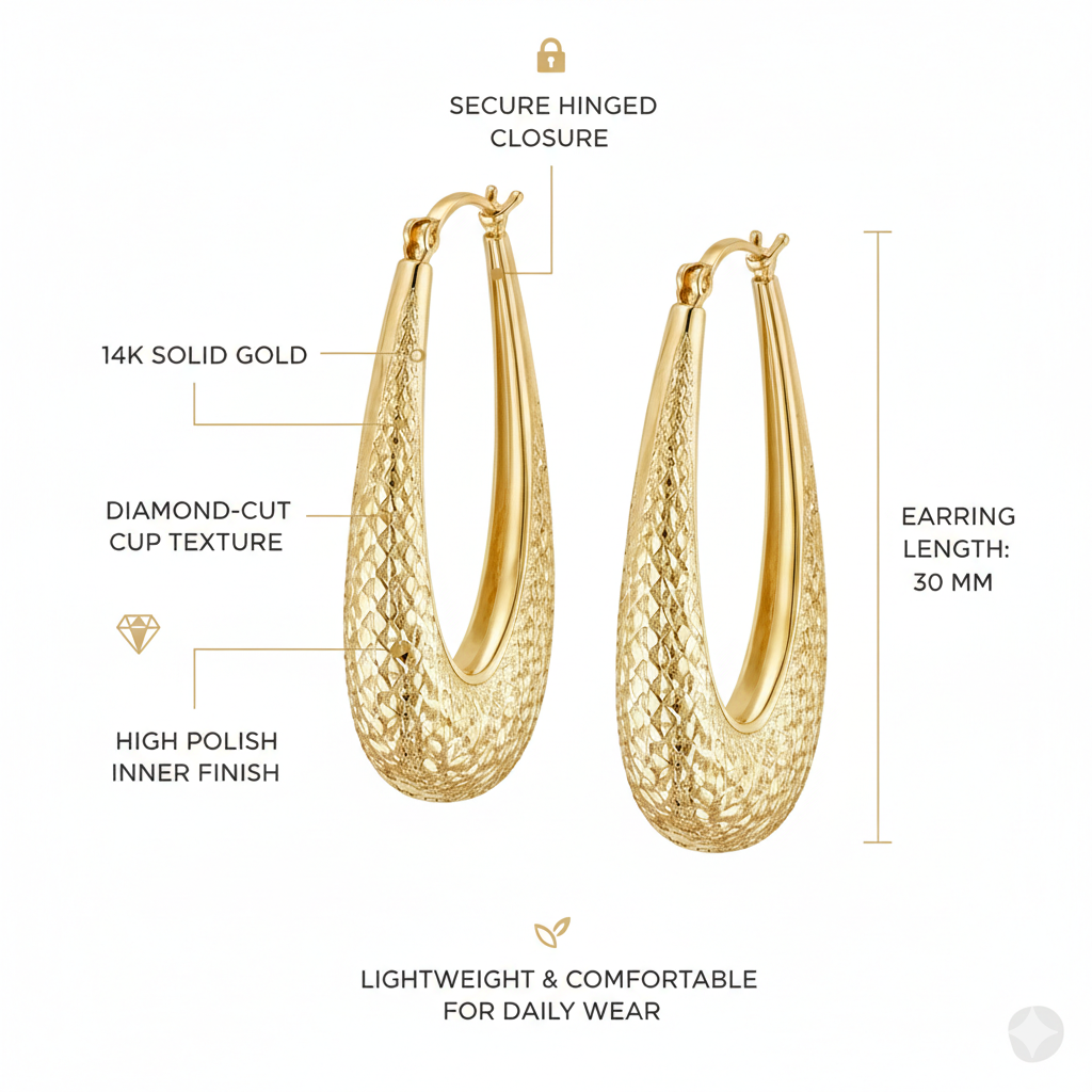 These stylish 14K yellow gold diamond cut elongated hoop earrings are designed to add extra brilliance with their finely textured diamond-cut finish. The elongated hoop shape creates a sleek, modern look while enhancing light reflection for a subtle sparkle.