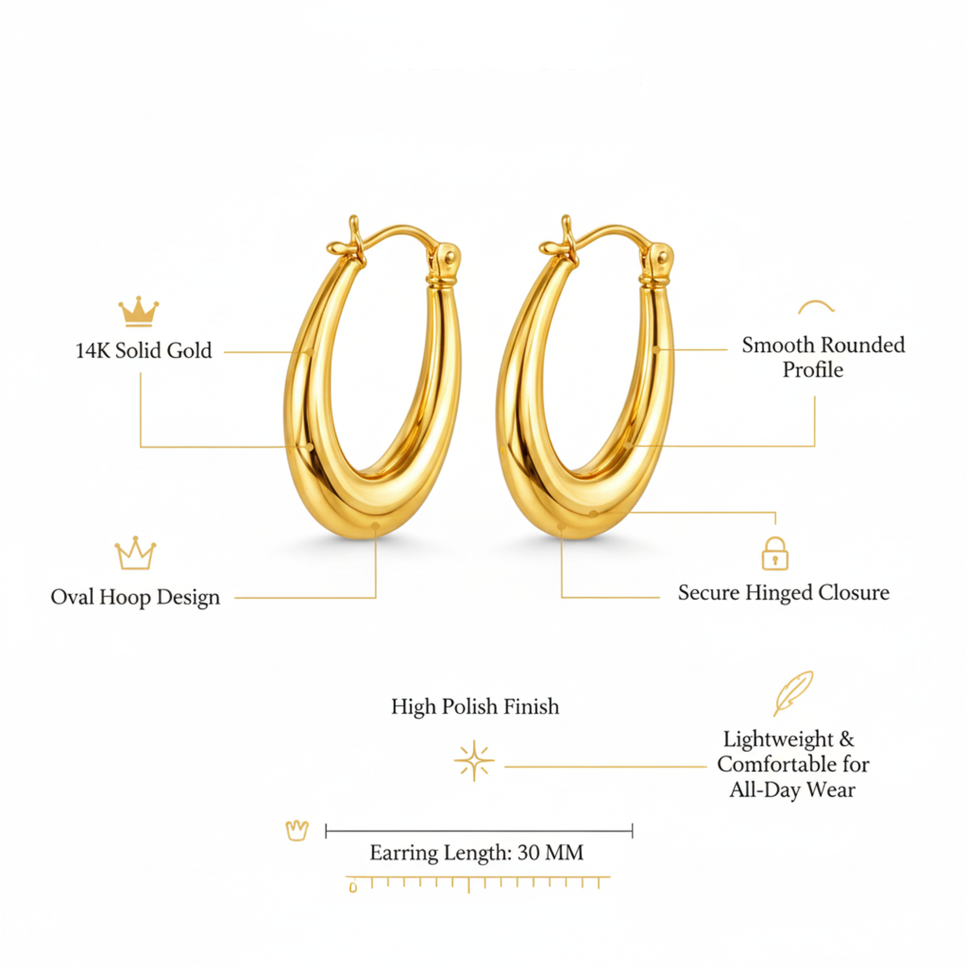 These elegant 14K yellow gold oval shape hoop earrings feature a smooth, polished finish with a refined oval silhouette that offers a modern twist on classic hoops. Designed in a 30MM size, they provide the perfect balance between everyday comfort and statement style.